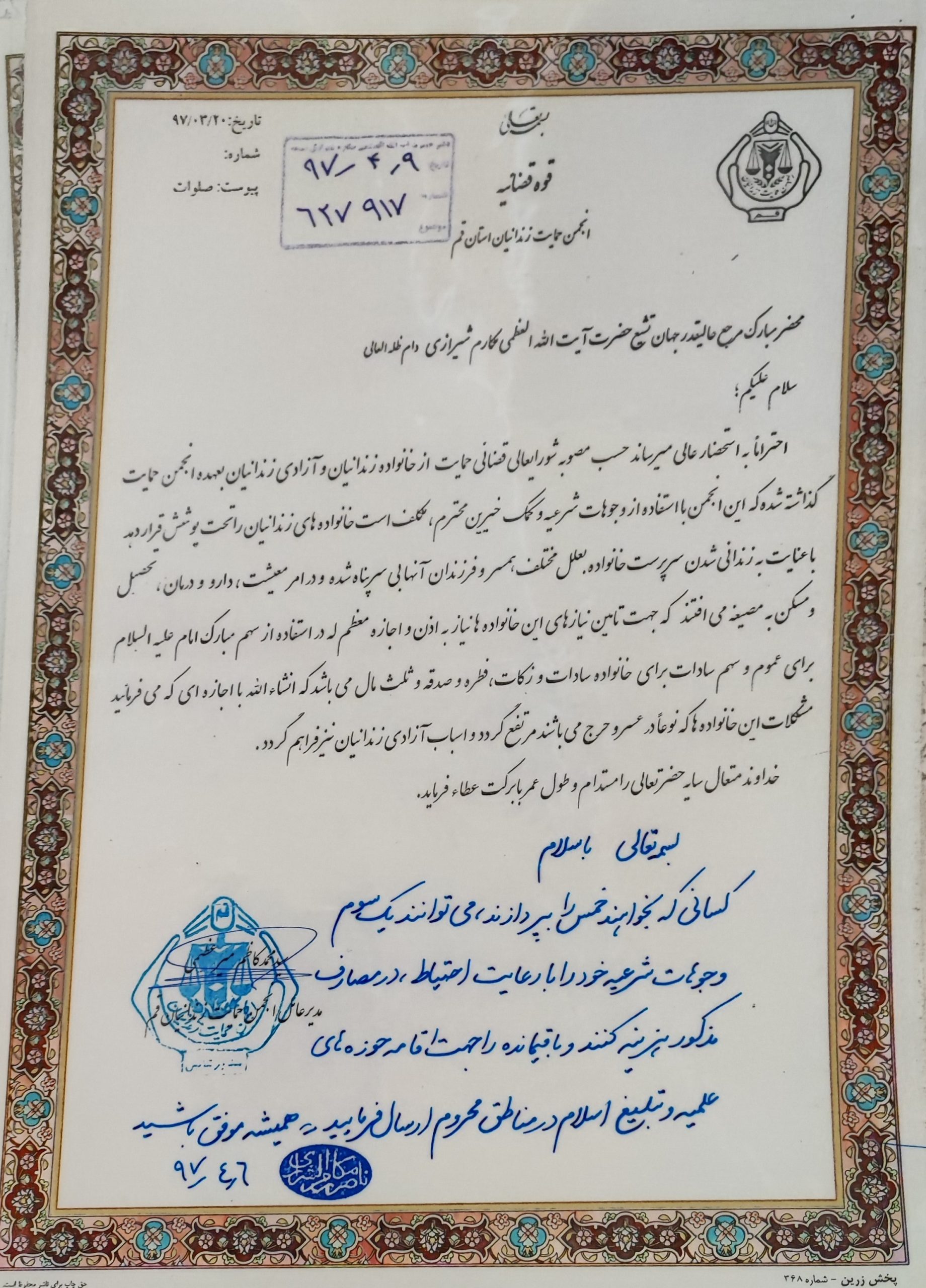 کسانی که بخواهند خمس را بپردازند، می توانند یک سوم وجوهات شرعیه خود را با رعایت احتیاط، در مصارف مذکور هزینه کنند و باقیمانده را جهت اقامه حوزه های علمیه و تبلیغ اسلام در مناطق محروم ارسال فرمائید.