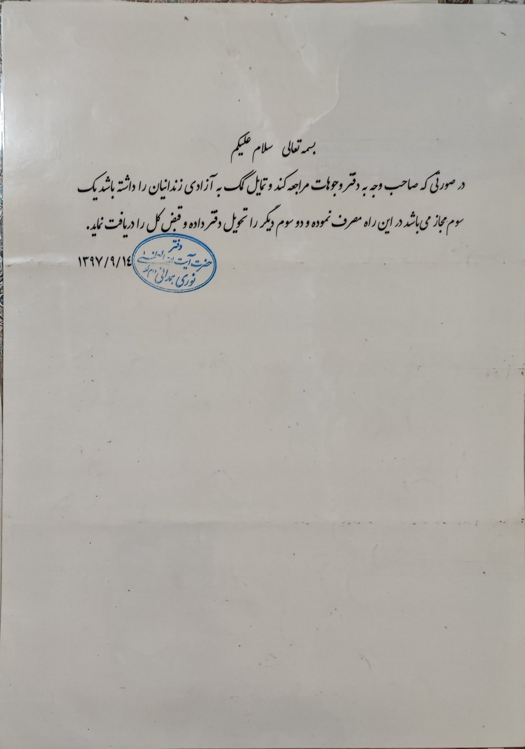 در صورتی که صاحب وجه به دفتر وجوهات مراجعه کند و تمایل کمک به آزادی زندانیان را داشته باشد یک سوم مجاز می باشند در این راه مصرف نموده و دو سوم دیگر را تحویل دفتر داده و قبض کل را دریافت کنند.